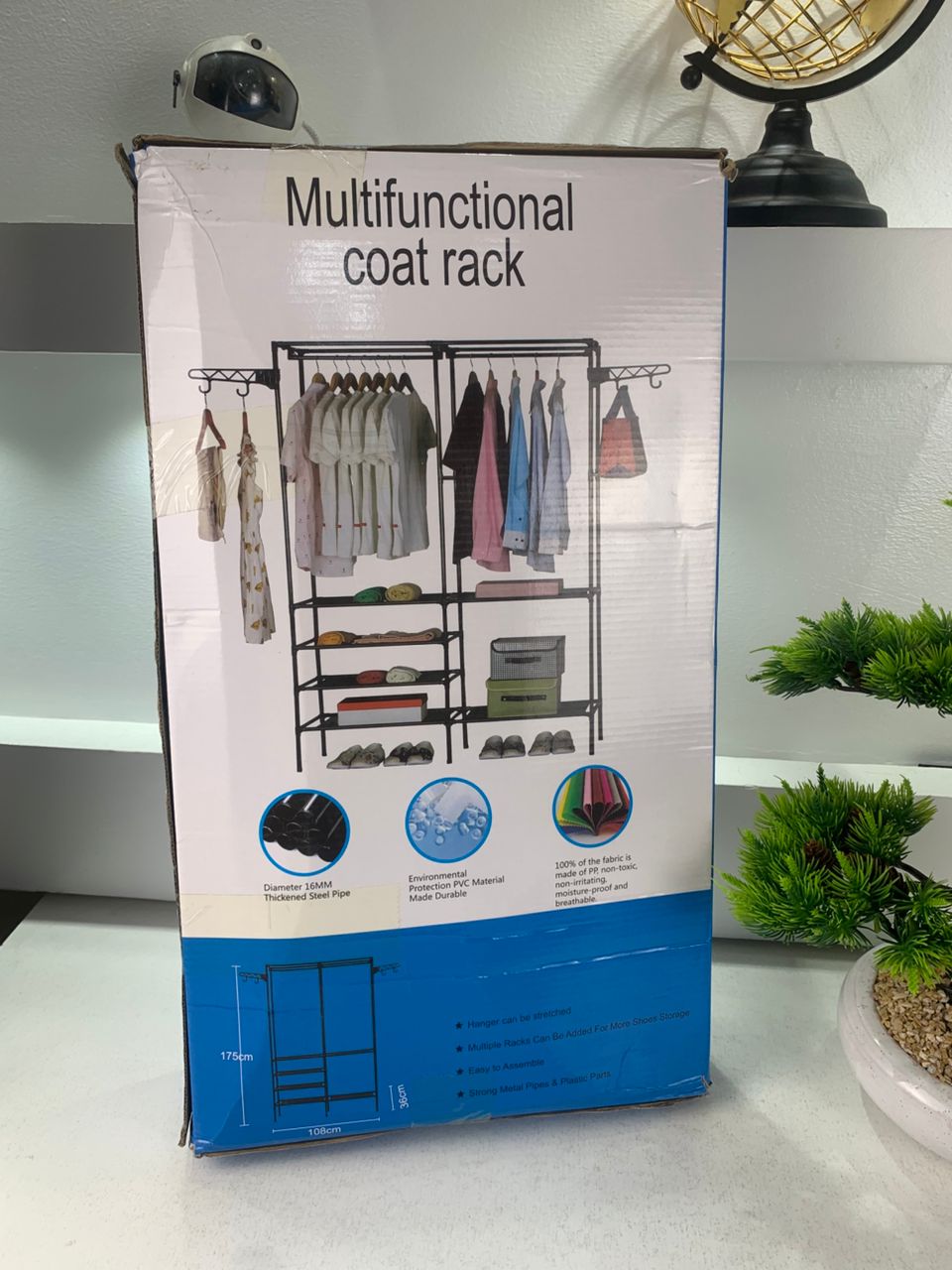 ⭐ المميزات :🏡 ديزاين عصري وأنيق: يزين الكوريدور، البالكون ولا أي غرفة فالدار.👕👗 متعدد الوظائف 2 في 1:زوج عصيان فوقانيين لتعليق المانتو، الجاكيطات، القمصان…4 طبقات تحتانيين باش تحطي الصباط، الكتب، الكادوات ولا أي أكسيسوار.🚶‍♂️ واقِف حر وما يحتاجش تثبيت: ما يضرش الحيطان، تقدري تنقليه وين تحبي.📦 توفير المساحة: يزيدلك بلاصة تخزني فيها الحوايج فالبيوت، الكوزينة، الكراج ولا حتى فالسطح.🛠️ ساهل فالتركيب والفك: يتجمع ويتفك في دقائق فقط.📏 المواصفات :الحجم: 108 × 36 × 175 سمقدرة التحمل: حتى 50 كغ